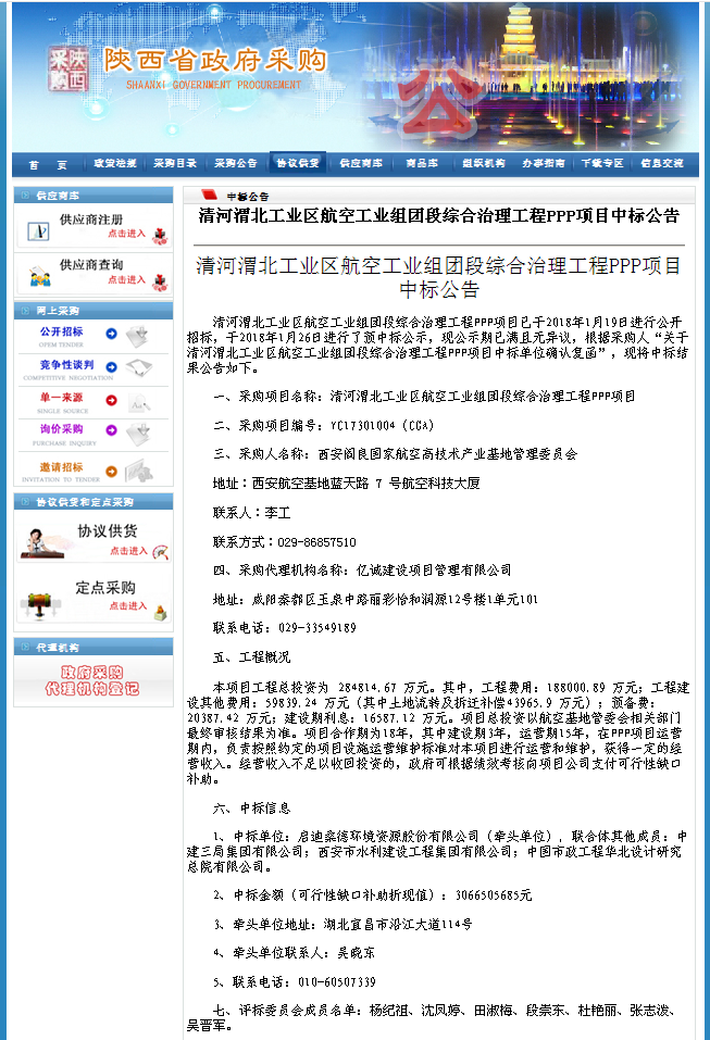 清河渭北工業(yè)區(qū)航空工業(yè)組團(tuán)段綜合治理PPP項(xiàng)目于2018年1月19日進(jìn)行了公開招標(biāo),經(jīng)評標(biāo)委員會評審,推薦以啟迪桑德環(huán)境資源股份有限公司牽頭,與中建三局集團(tuán)有限公司、西安市水利建設(shè)工程集團(tuán)有限公司、中國市政工程華北設(shè)計研究總院有限公司組成的聯(lián)合體中標(biāo)。